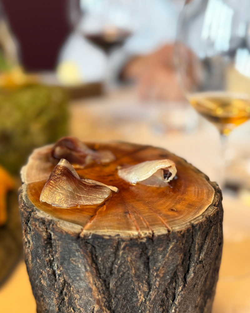 Pichón: Marinado en salmuera de anchoa, cocinado a la brasa y caldo de sardinas.